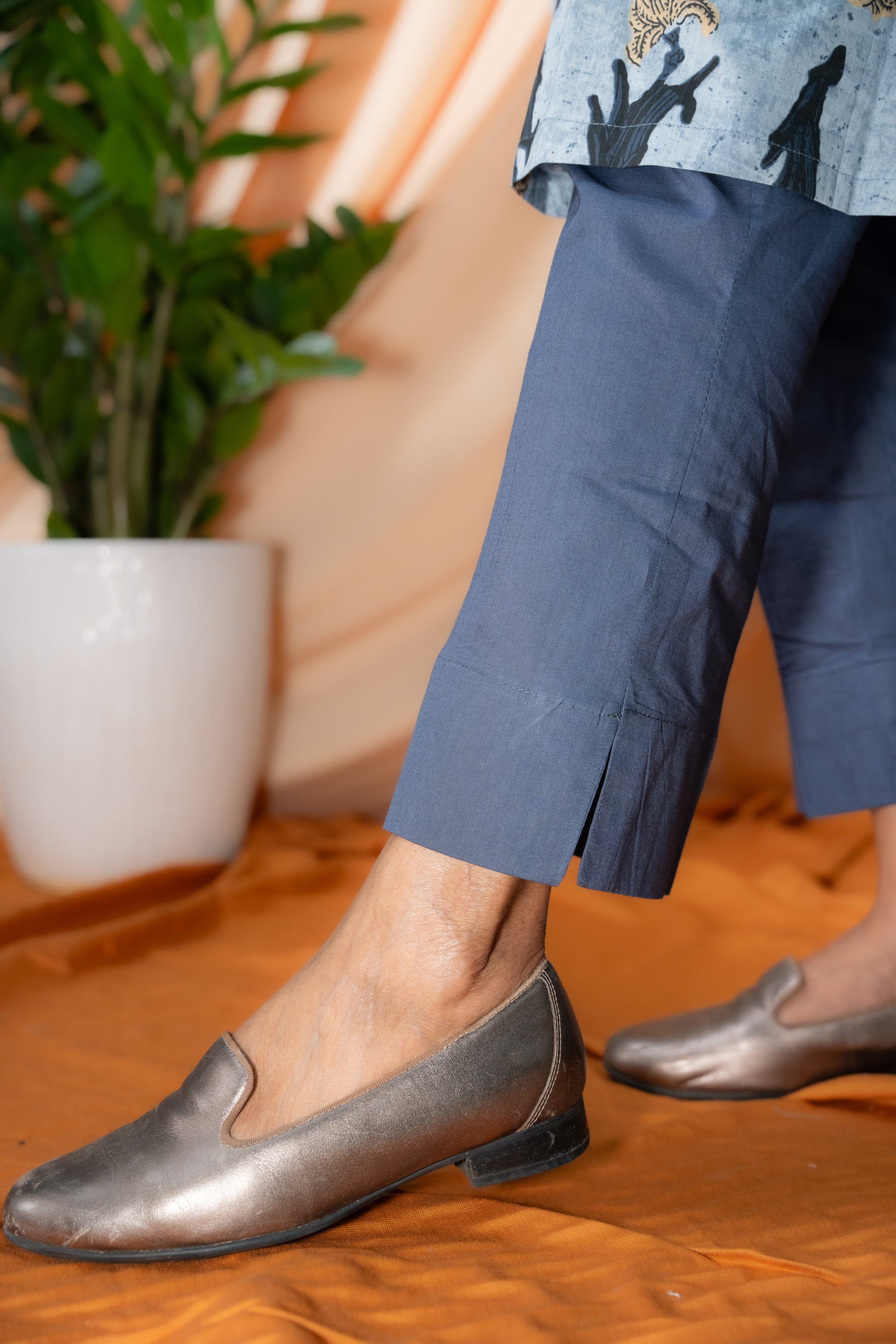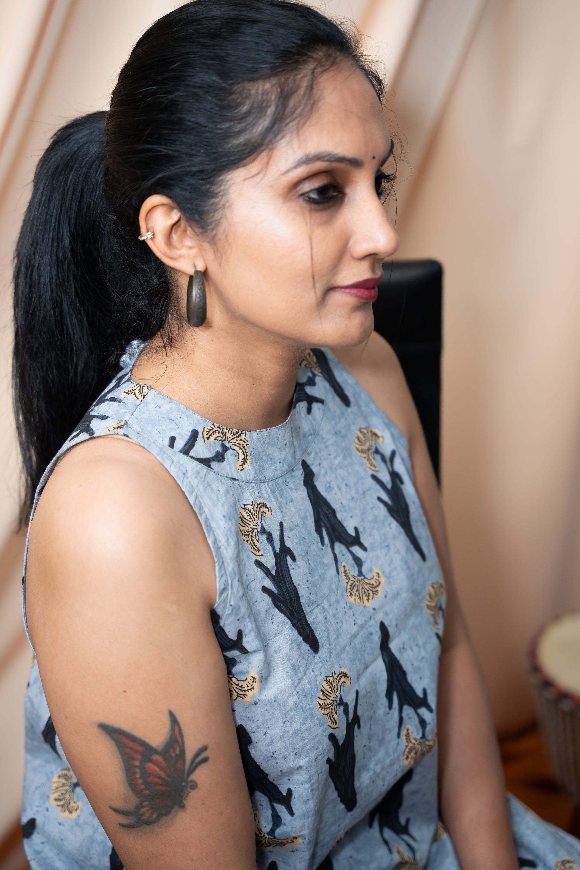 Pure cotton kurta with hand block motifs in dark grey and pinewood tones. Features a halter neck and A-line fit. Light, breathable, and easy to wear.