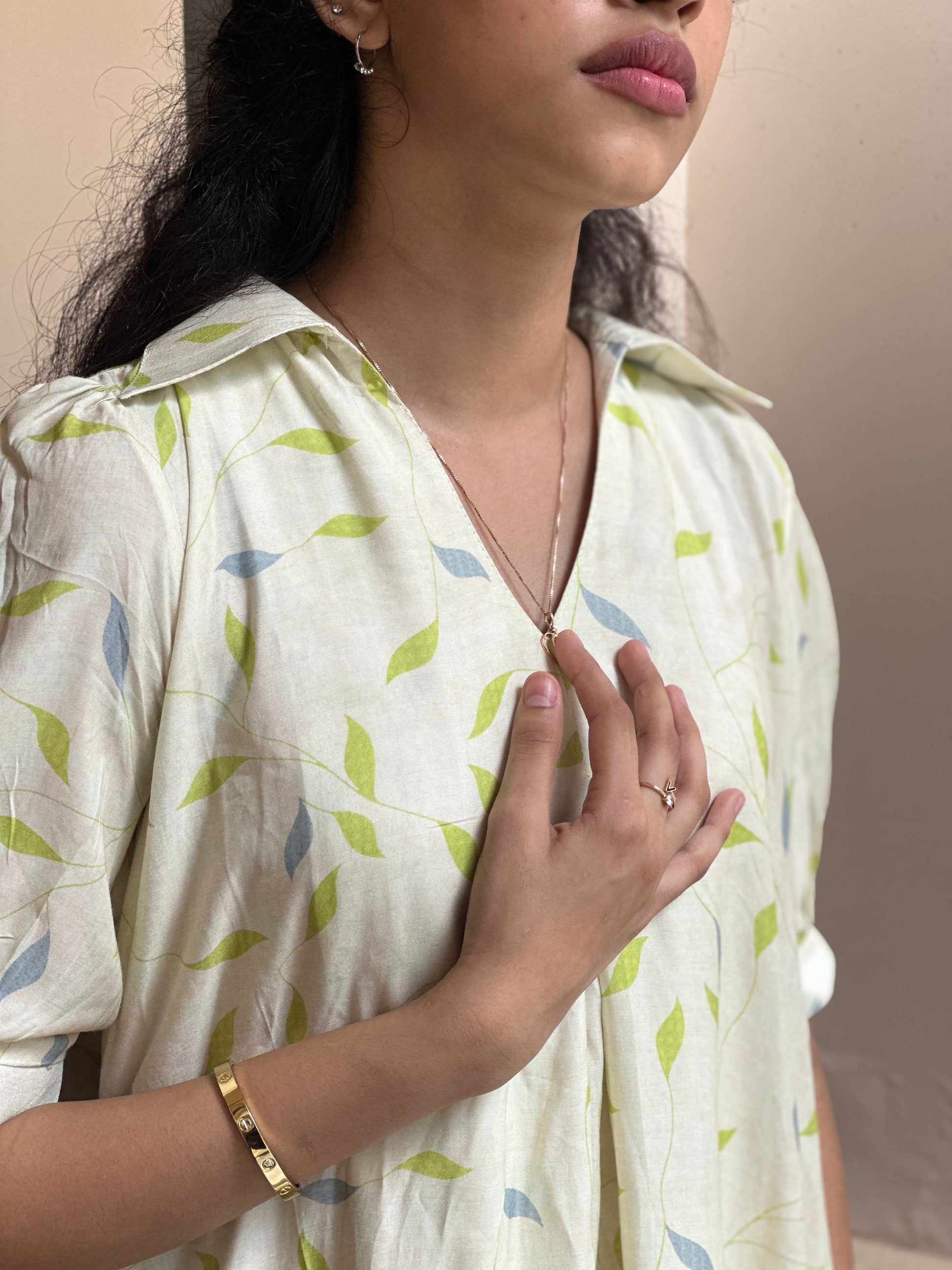 Flowy A-line muslin dress with green and blue leaf prints. V-neck with collar, puffed sleeves, and side pockets. Light and easy for casual days.