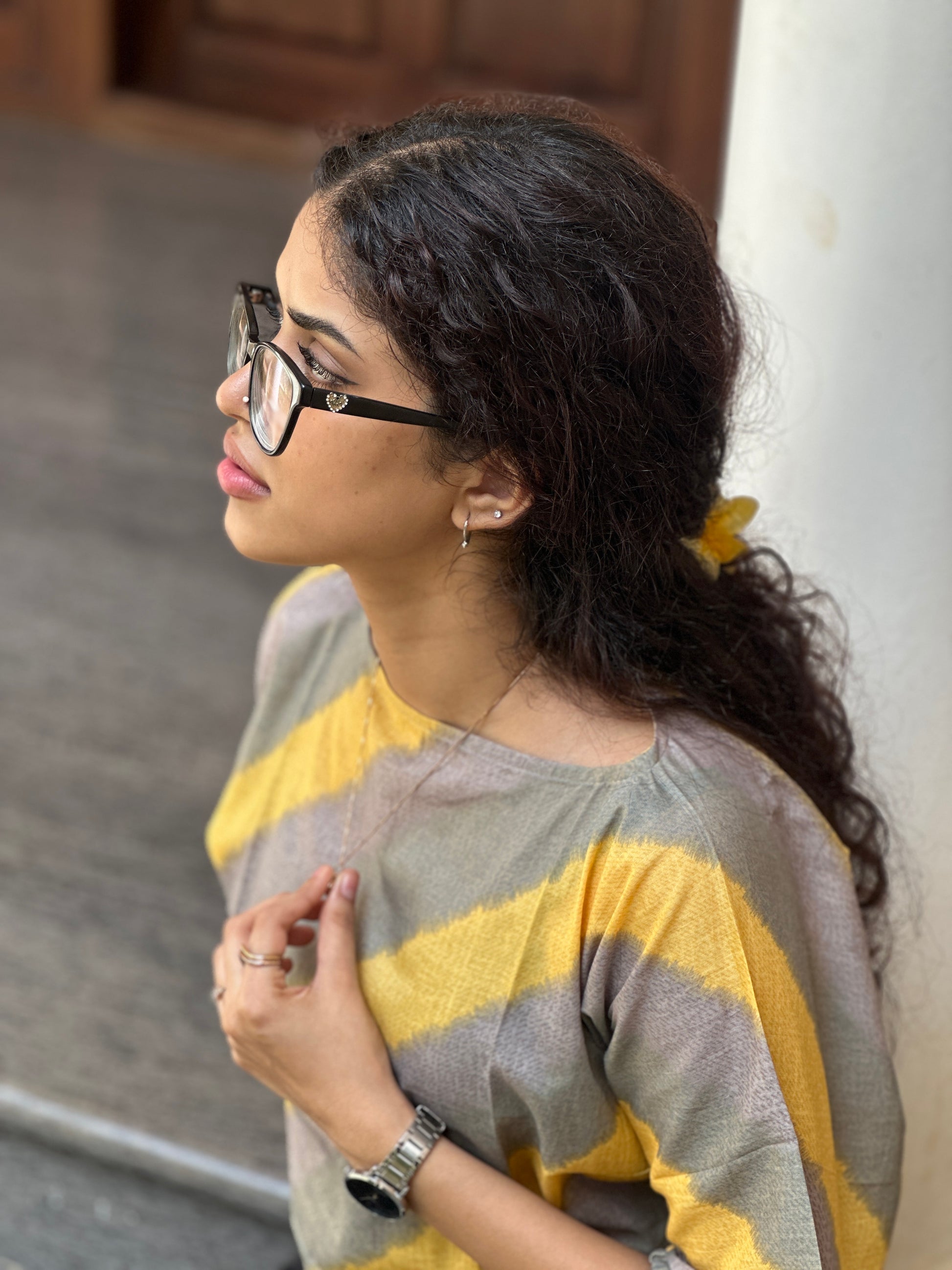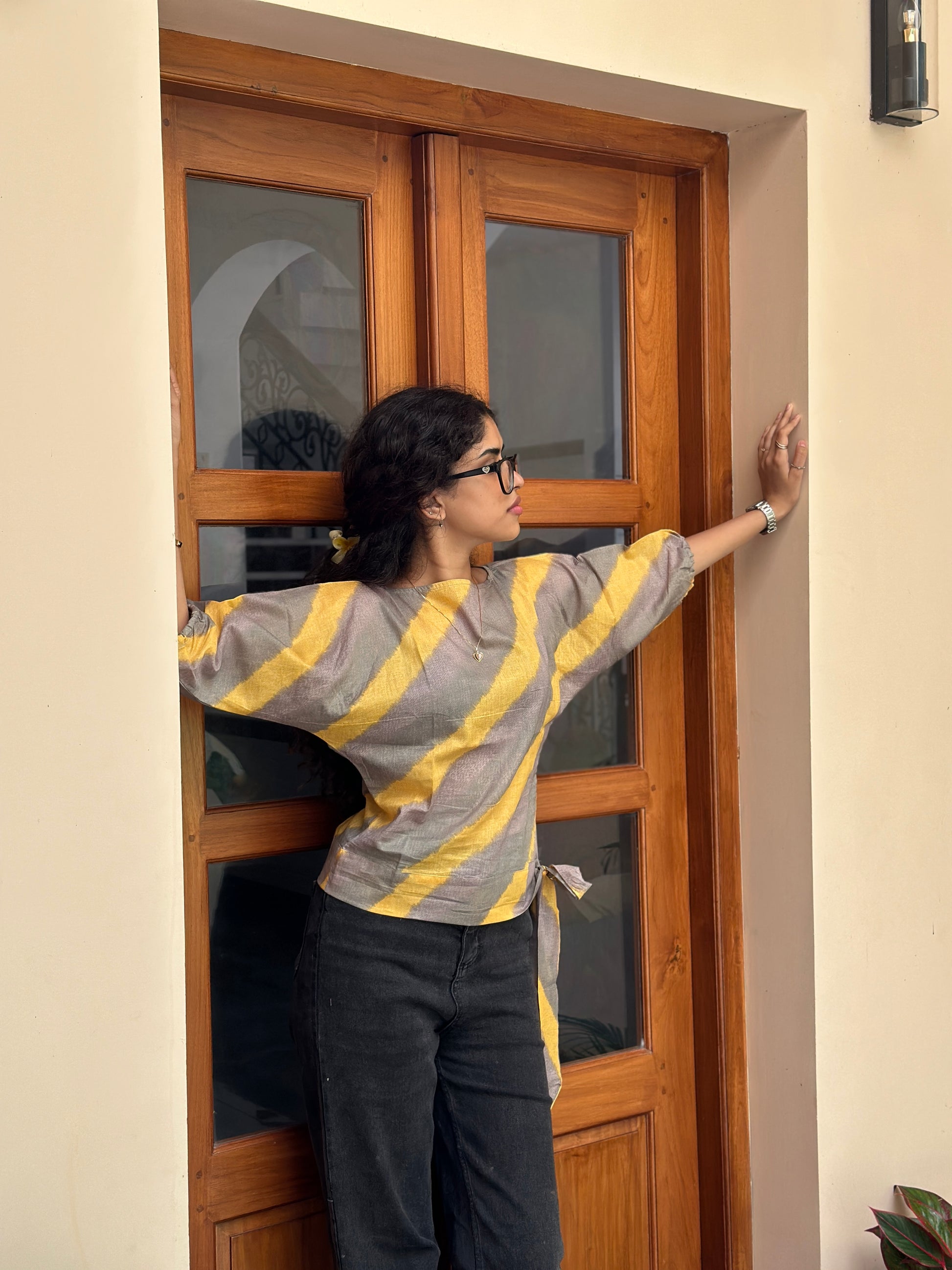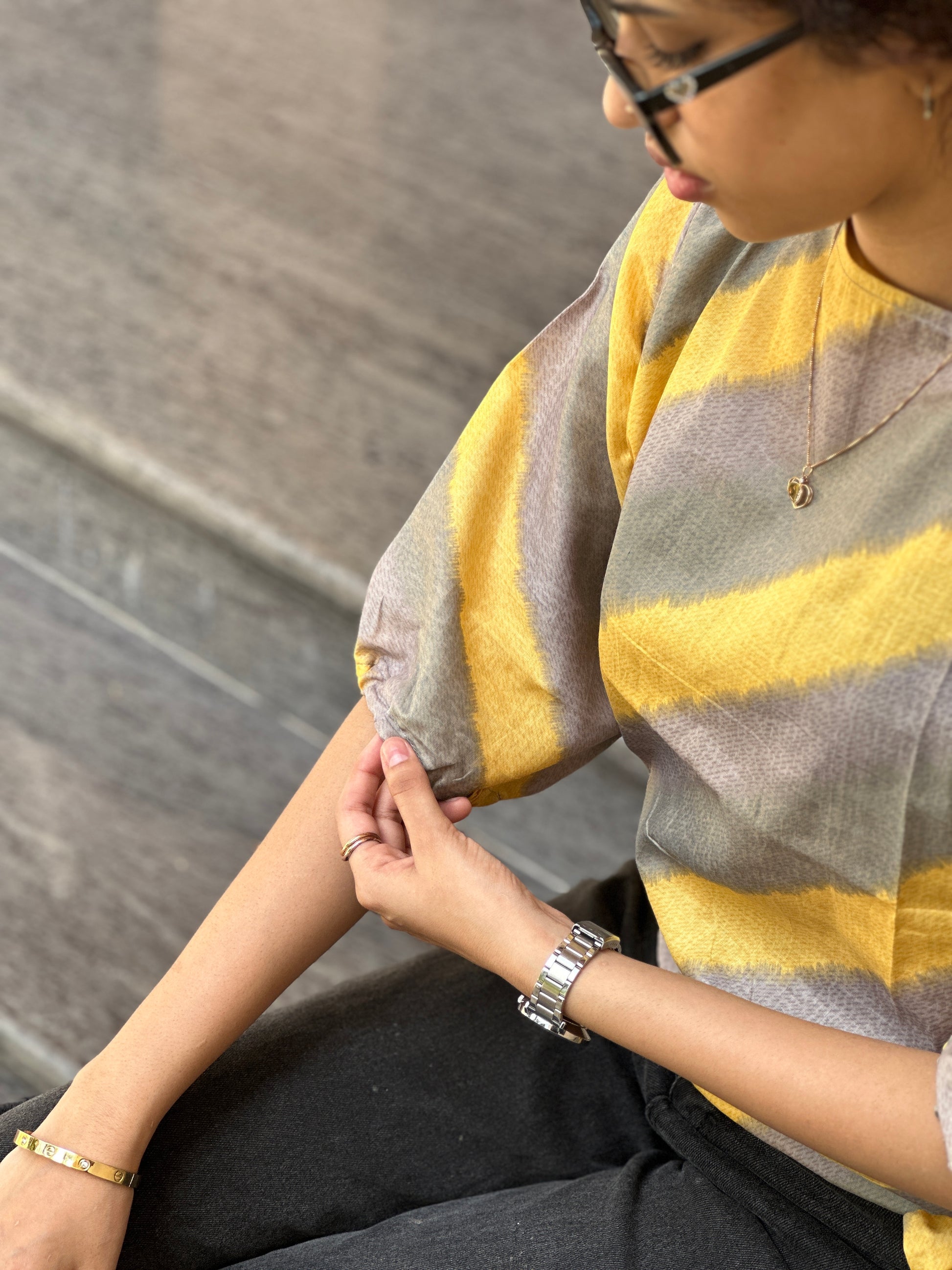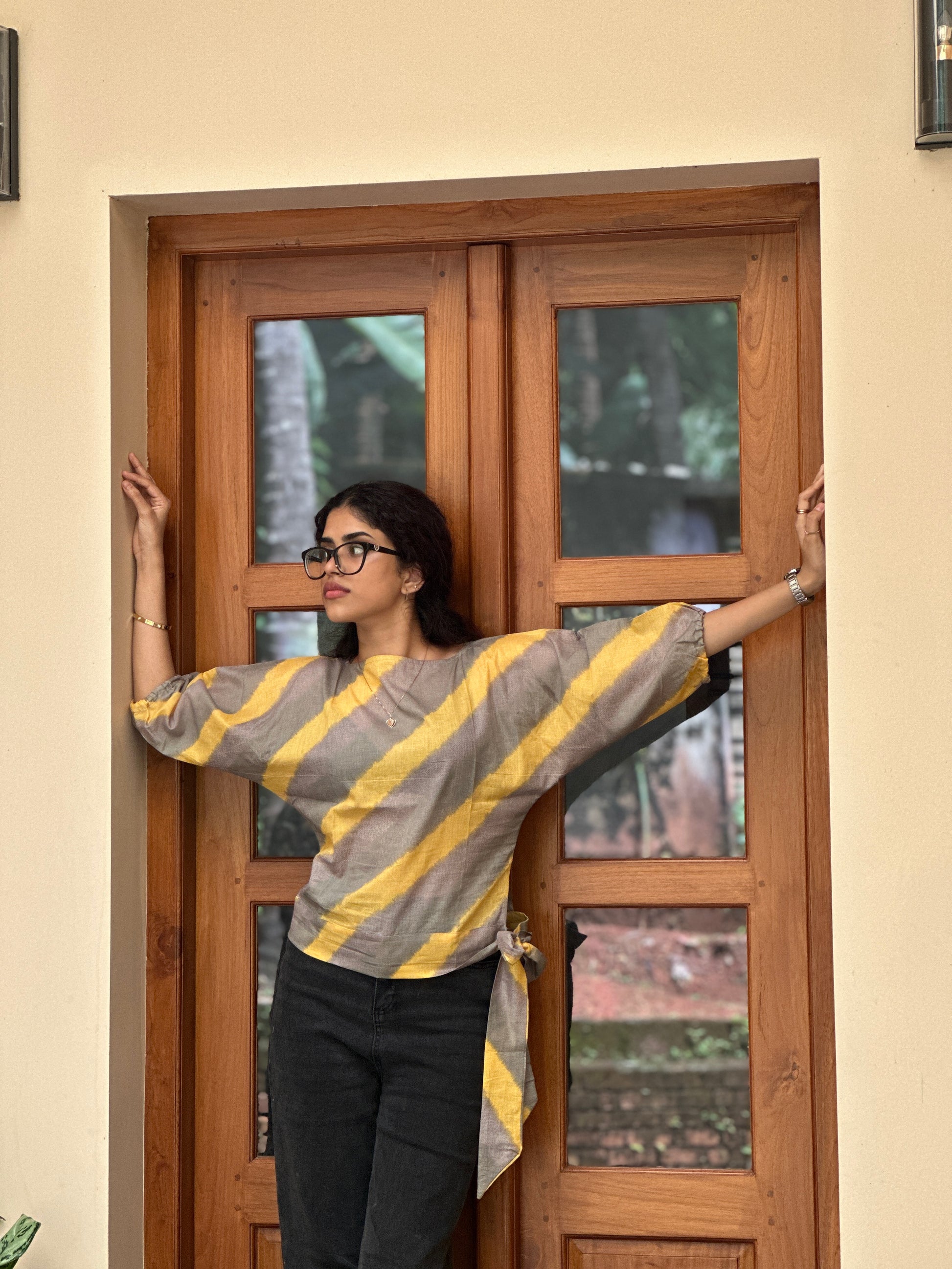 A Breezy soft cotton top with relaxed dolman sleeves and soft diagonal stripes for effortless everyday ease.
